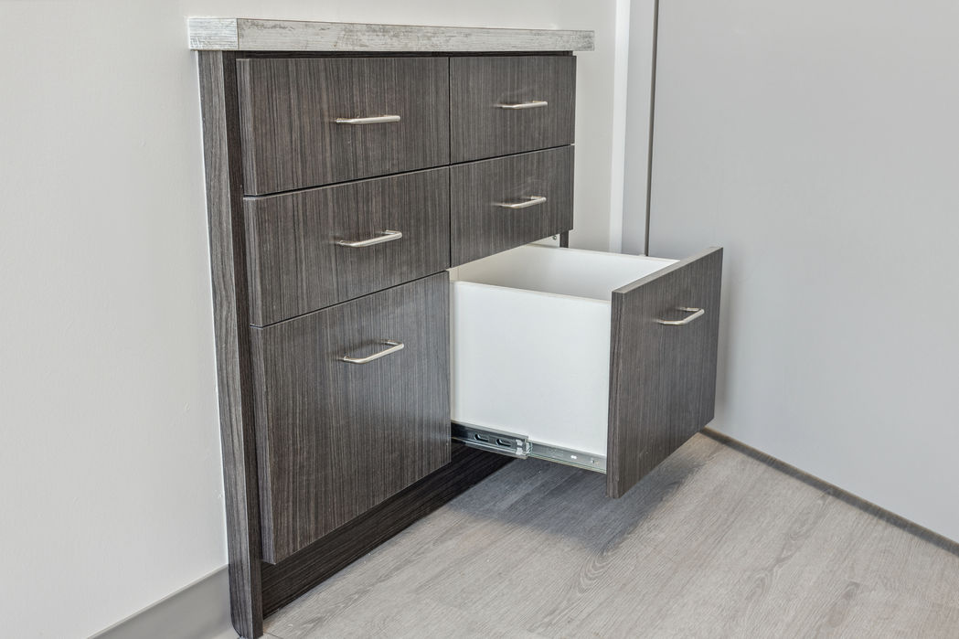 Custom millwork, integrated storage, and clean-lined cabinetry maximize efficiency and organization throughout the space. Neutral finishes, durable flooring, and streamlined fixtures were selected to meet the demands of a busy medical practice while delivering a refined, contemporary look.
