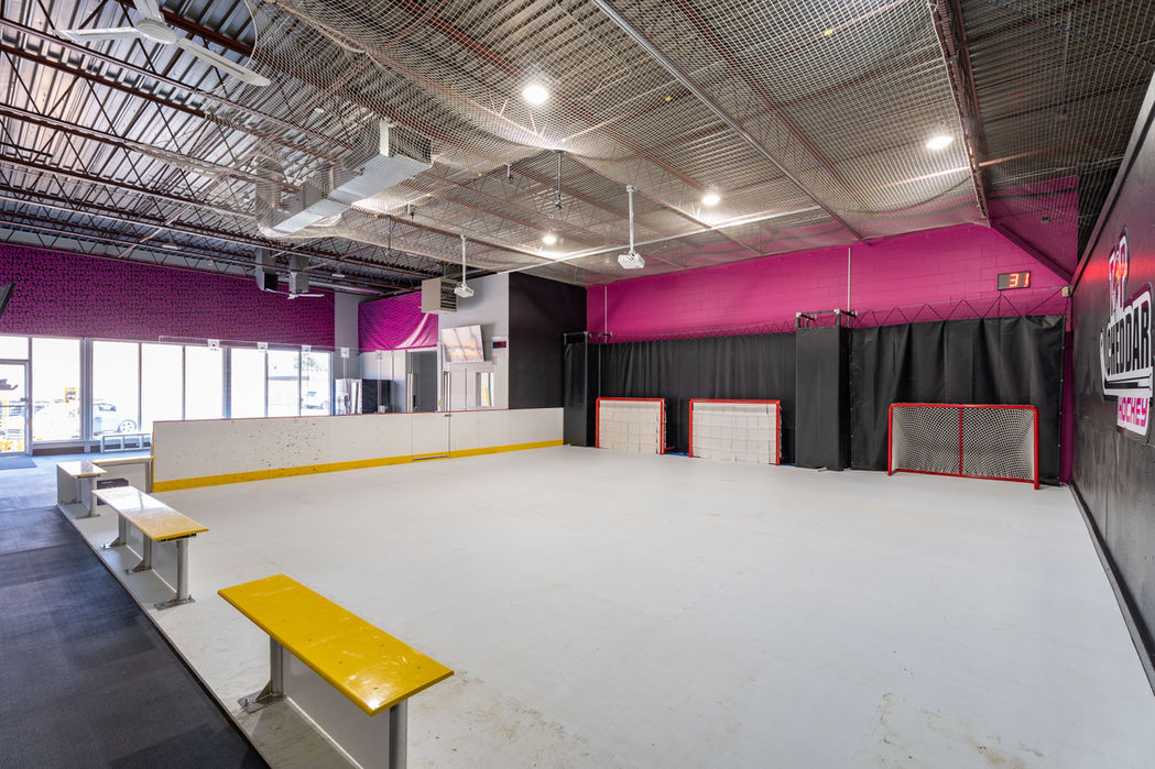 Top Cheddar's brand identity is prominently displayed on the main wall and painted on the ice surface, while the distinct black and fuchsia colour scheme is seamlessly integrated throughout the space to give the facility a bold, cohesive look.